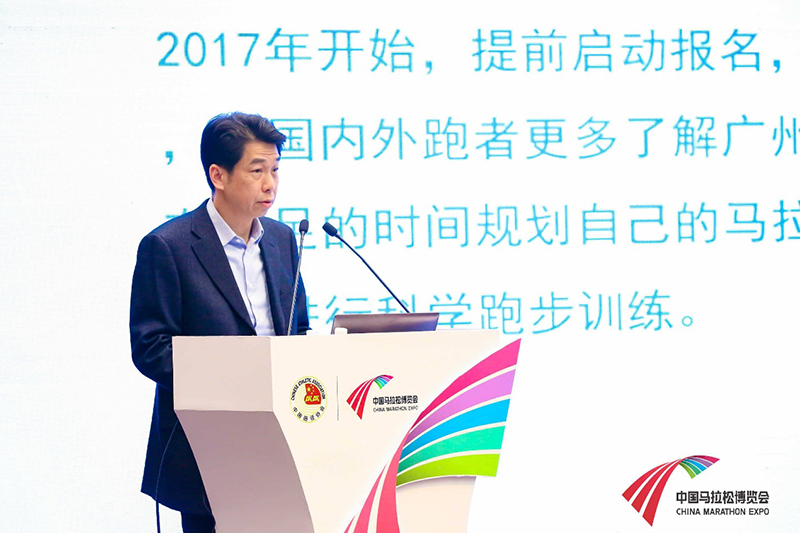 ▲ 廣州市體育競賽中心主任黃建庭先生發(fā)表“廣州馬拉松賽事分享”主題演講
