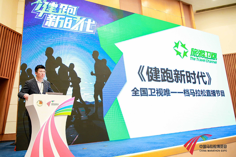 ▲ 旅游衛(wèi)視助理總裁王兆林先生發(fā)表“《健跑新時代》全國衛(wèi)視中唯一一檔馬拉松直播節(jié)目”主題演講