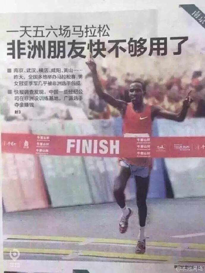 經(jīng)常參加馬拉松的跑友會發(fā)現(xiàn)這么一個有意思的現(xiàn)象:前面領跑及最終奪冠的選手,基本上都是黑人。據(jù)每日經(jīng)濟新聞記者了解,國內(nèi)各大馬拉松賽事,尤其要打造金標賽事的城市馬拉松,主辦方都要邀請黑人參賽。