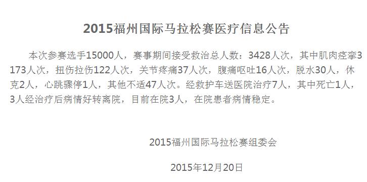 遺憾的是,首屆福州國(guó)際馬拉松賽發(fā)生了一起悲劇,20日上午8點(diǎn)40分,參賽者盧某在離開(kāi)半程馬拉松起點(diǎn)10.5公里處突然倒地,搶救無(wú)效死亡。此外,福馬組委會(huì)還發(fā)布賽事醫(yī)療信息公告。