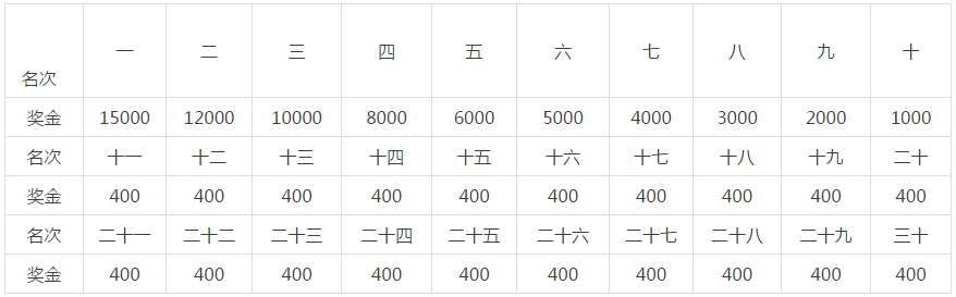 1、男、女組按芯片計時成績分別錄取前30名進行獎勵(見表,單位:美元);前三名獲得者各獲名次獎牌一枚。